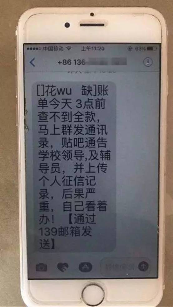 次日,范泽一父亲的手机就开始陆续收到数十条信息,信息内容都是追讨债务。其中一条为:账单今天3点前查不到全款,马上群发通讯录,贴吧通告学校领导及辅导员,并上传个人征信记录,后果严重,自己看着办!