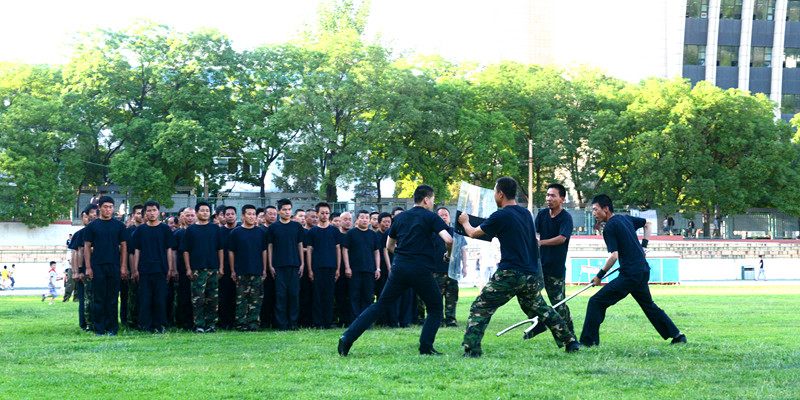 由校园110警卫队员60 人组成的演练分队,分别按照队列、擒拿制服歹徒、擒敌拳、倒功的顺序一一进行了演练。演练结束后,太原市直属分局副局长尹群做了重要讲话,他指出在国内反恐形势严峻、恐怖就在身边的情况下,中北大学安全保卫部能够紧抓形势进行反恐维稳实战特训演练,非常及时和必要,这在山西高校的第一家。