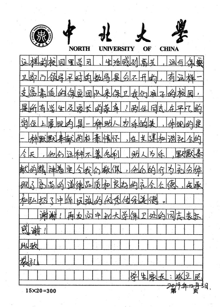 事后第二天,家长及时赶往学校,心情久久不能平静,特地向校安全保卫处写了这封感谢信,感谢王俊伟、刘国安两位保安同志的热心帮助。家长在信中深情的写到:“在这样寒冷的夜里避免孩子独自在外,夜宿街头产生的严重后果,使得我家孩子伤势拯救及时,身上没有任何一处被冻伤。此事虽小,意义重大,两位同志的职业操守令人敬佩,同时也为孩子能在这样的校园学习、生活感到高兴。”