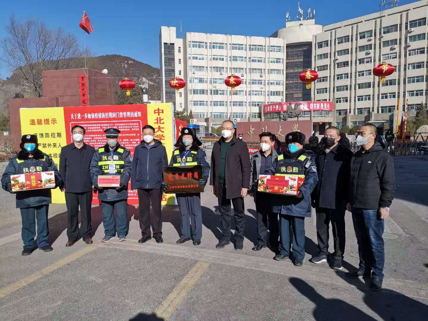 2020年2月3日上午,太原市国资委党委委员、副主任孟永宁, 太原市保安公司党委书记、董事长郭强一行来我校慰问安保人员,在前期调研的基础上,授予我校保安队“党员先锋岗”称号。