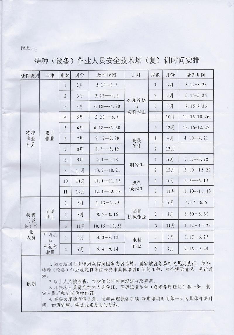 2、特种(设备)作业人员安全技术培(复)训时间安排