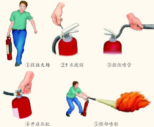1、提。用手握住灭火器提把提起灭火器,平稳、迅速地到达现场。